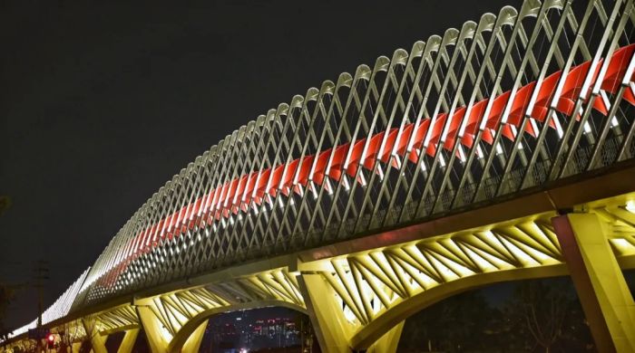 其次,每一个点位的灯具安装角度都要精确,经过反复的调试,以便能精准的展现桁架的曲线肌理。最后就是灯具的隐蔽性,除了做同色处理外,项目施工方在不改变建筑结构的基础上采用了特殊的遮挡措施,使灯具与桥体融为一体,真正做到见光不见灯。