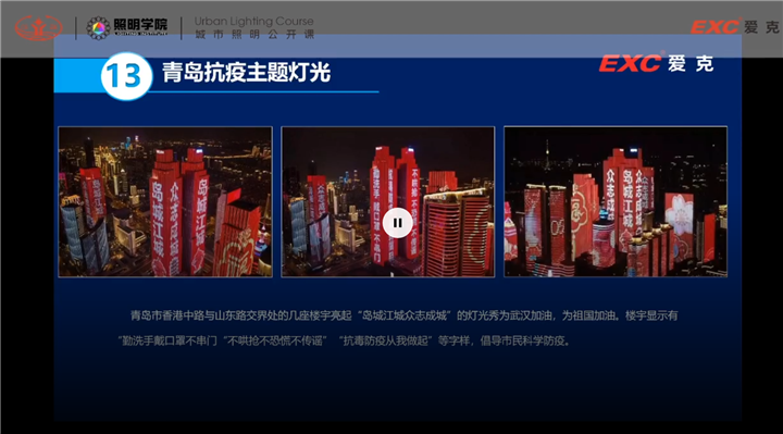 其中,爱克莱特副总经理兼物联网应用事业部总经理王嵬毅在公开课具体阐述了照明云控系统在武汉疫情期间发挥的作用,爱克莱特灯光保障技术支持小组借助照明云控系统,以远程操作、视频沟通等多种形式协助北京、深圳、杭州、重庆、天津、海口、郑州等城市在地标建筑媒体立面上亮出“武汉加油”、“中国加油”字幕,利用建筑“屏”发声,用“光”鼓舞士气,用“光”点燃信心,为政府发声、应急广播、传递疫情信息、护城佑民起到非常重要的作用,用光传递温暖守护信念,众志成城共克时艰!